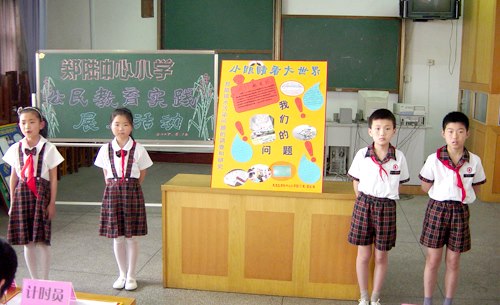 5月16上午,郑陆中心小学举行了公民教育实践活动听证会展示。展示内容分为问题研究文件夹和学生模拟听证会两个部分。参与实验的班级在展示前认真对本校的公民教育实践活动进行了梳理、总结,特别是听证会又一次为学生们提供了锻炼的机会。参加此次展示的活动涉及到我校四、五两个年级三个项目:关于我镇小学生上下学安全问题的调查与研究、郑陆镇水污染问题的调查和研究、关于乱写乱贴非法小广告问题的研究。