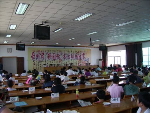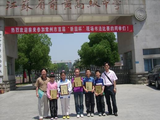 2009年5月10日上午,由常州市教育学会书法专业委员会主办,武进区前黄实验学校承办的常州市首届“新园杯”书法现场邀请赛拉开帷幕。来自常州市区、武进区、金坛市等学校的近100位小小书法家进行激烈的现场角逐。我校由沈晓锋教导严密组织协调,亲自带队督导,五(2)班牟睿钦,五(3)班曹振武,六(3)班陆航,六(4)班刘长荣,六(5)班沈柯荣五位同学的现场书法作品,受到专业评委的一致好评,均获得三等奖,这是我校坚持常抓书法特色教育的又一成果。
