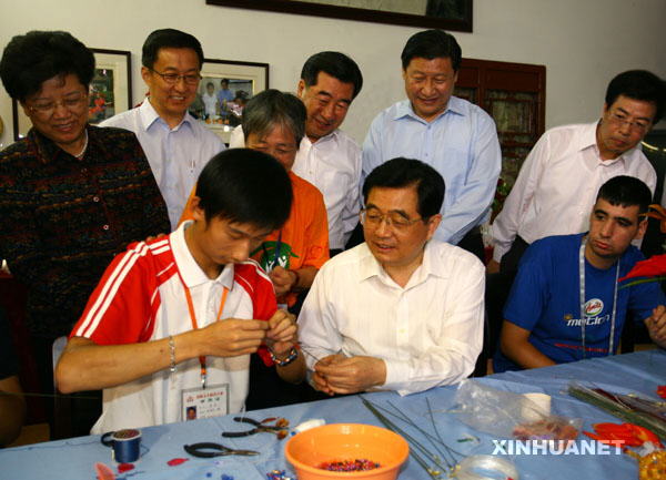 2007年世界夏季特殊奥林匹克运动会将于10月2日在上海开幕。1日上午一抵达上海,胡锦涛就特地来到虹口区曲阳社区专门为智障人士设立的“阳光之家”,实地察看智障人士在这里开展生活技能学习、康复训练、特奥运动的情况。“阳光之家”里,一些中外智障人士在老师辅导下,有的做绢花,有的学茶艺,有的弹钢琴,有的上网浏览,一些前来这里活动的中外特奥运动员正在联手创作喜迎特奥会的长画。在教育培训室,学员们正在上“祖国妈妈生日好”的主题课。胡锦涛来到他们面前,亲切地问:“你们知道今天是什么日子吗?”几位学员争相回答:“知道,今天是国庆节。”胡锦涛又问:“你们怎么庆祝国庆啊?”学员们回答:“我们自己制作了五星红旗。”听了学员们的回答,胡锦涛脸上露出欣慰的笑容。他对大家说,祖国是我们的母亲,我们每个人都要爱自己的祖国,都要为祖国争光。胡锦涛还同前来这里活动的希腊特奥运动员交谈,欢迎他们来上海参加特奥会,祝他们取得好成绩。在户外小操场,胡锦涛走到正在活动的中外智障人士中间,同他们一道做起了传彩球的游戏。他还兴致勃勃地当起了中外特奥运动员拔河比赛的裁判,挥动小红旗为他们加油,操场上传出一阵阵欢声笑语。看到智障人士在“阳光之家”学到不少东西,过得很开心,胡锦涛感到十分高兴。他勉励智障人士好好学习,勤于锻炼,不断取得新的进步。