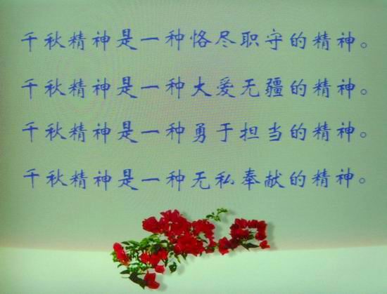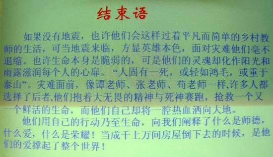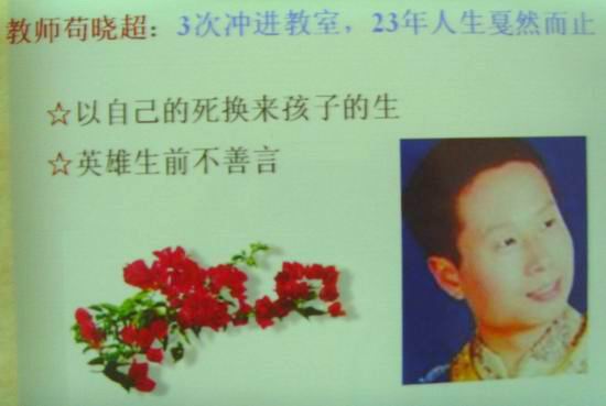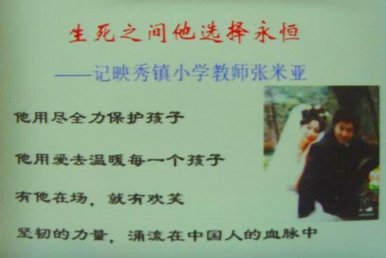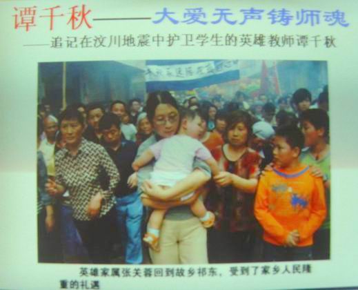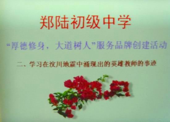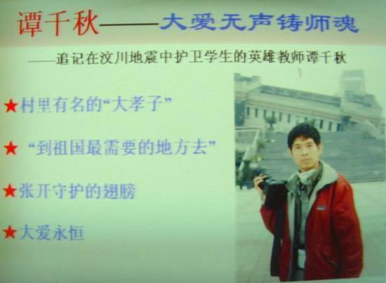 2008年8月28日下午,学校组织全体教师学习在汶川地震中涌现出的英雄教师的事迹。谭千秋——大爱无声铸师魂、张米亚——摘下我的翅膀,送给你飞翔、苟晓超——以自己的死换来孩子的生,他们用自己的行动乃至生命,向我们阐释了什么是师德,什么爱,什么是荣耀!当成千上万间房屋倒下去的时候,是他们的爱撑起了整个世界!