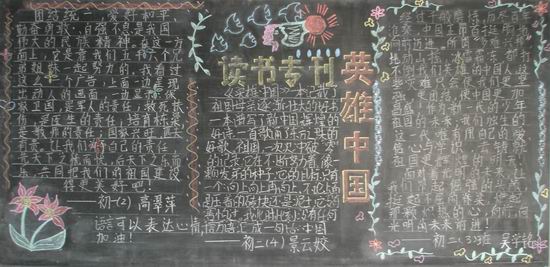 1、利用班团队活动课组织集体学习。各班事先做好充分准备,利用假期先组织学生分组自学《英雄中国》中学生读本各部分内容,找出精华部分。还到学校图书馆借阅有关资料,充实学习内容。在班级主题活动中,有学生代表讲解,有邀请语文、政治老师讲解,班主任讲解,学生谈体会,学生演讲等。然后组织学生写活动感想、体会。